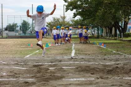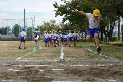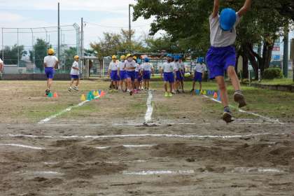 走り幅跳びの測定を行いました。前回からの記録の伸びを確かめました。体全体を使って跳ぶことができるようになってきていますよ。