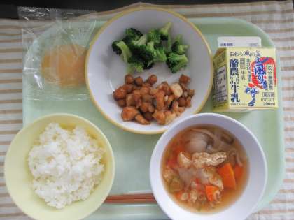 今日の献立は、ごはん、魚とひよこ豆の甘からめ、ゆでブロッコリー、すまし汁、冷凍りんご、牛乳です。