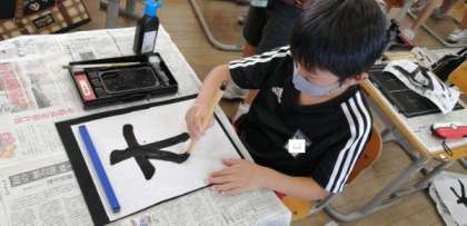 横画、縦画、左はらい、右はらいの学習を生かして、「木」という漢字を書きました。同じ「はらい」でも、左のはらい方と右のはらい方は、筆づかいがちがいます。「トン、スー」のリズムと「トンスー、ググッ、スー」のリズムで、だんだん「はらい」の感じをつかむことができるようになってきました。次回は清書で、文化祭に出展刷る作品づくりです。力作がそろうことを楽しみにしています。