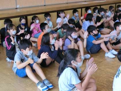 3年生は、学習発表会についての学年集会でした。最後にみんなでボディパーカッションに挑戦している風景です。