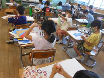 包装紙や和紙等の破いた形からイメージを膨らませて、作品づくりをしています。破った包装紙を見ながら、楽しそうに画用紙において、自分の想像の世界に入り込んでいました。素敵な作品になりそうです。