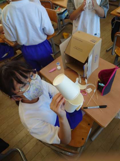 紙コップや輪ゴムを上手に使いました。