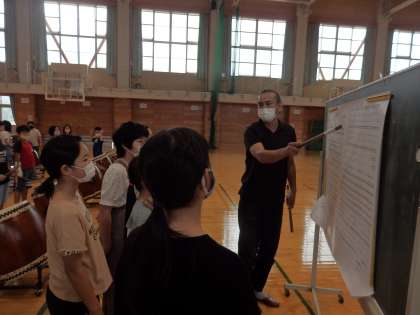 構えの姿勢を改めて確かめたり、楽譜を見ながらリズムを確認したりしました。教えていただいたことを生かして、明日は子供たちで自主練をします。