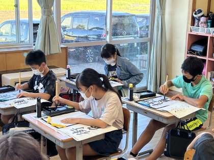 書写では、3つの部分をもつ漢字である「街」を、字形を整えて書く学習をしています。今日は、前回書いた自分の作品を分析し、改善点を考え、「街角」を清書しました。