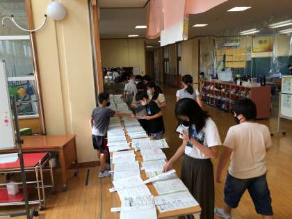 家庭学習チャレンジ週間が終わりました。今日は、自主学習の交流会を学年で行いました。互いの自主学習ノートを見合い、よりよい自主学習を目指します。