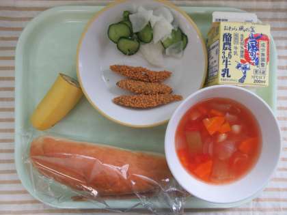 今日の献立は、米粉コッペパン、きびなごのさくさく揚げ、かぶのサラダ、トマトスープ、バナナ、牛乳です。