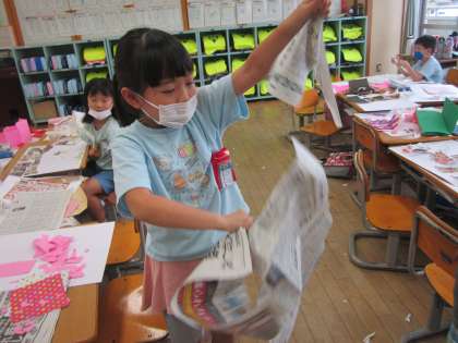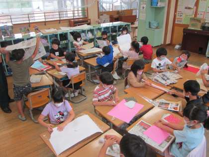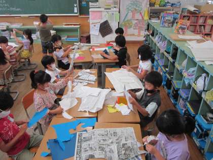今日は1組の図工でも、「やぶいたかたちからうまれたよ」を学習しました。紙をびりびり破くことに、最初は戸惑う様子でしたが、慣れてくると思いっきり破いたり、指先をうまく使ってゆっくり破いたり・・・紙を破く感触、音、できた形を楽しんでいました。