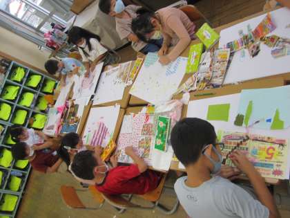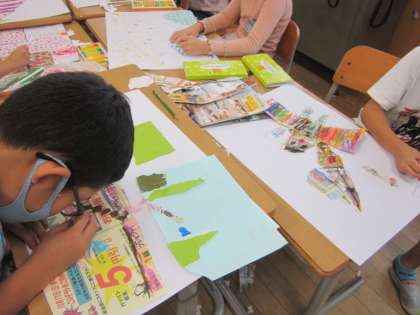 破いた紙が何に見えるか考え、画用紙に貼りました。友達と「何に見える?」「紙の向き変えたらどうかな?」「○○に見えて面白いね」「こんな絵を付け足すと、わかりやすいよ!」など、アイデアをもらったり、さらに工夫したりしながら、面白くすてきな作品を作り上げていました。来週は、背景などに絵の具で色を付ける予定です。