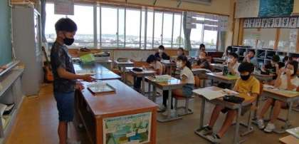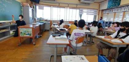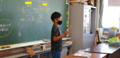 「蒸発した水はどこへ行くのだろう?」「再び戻るのか?」ということについてみんなで予想していました。「担任の先生はどーこだ?」…先生は舵取りをするだけで、子供たちが、次々と自分の考えを発表しています。ときには前に出て、黒板を使って説明します。そして、友達の話を、しっかり聞いている子供たちです。