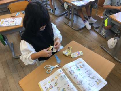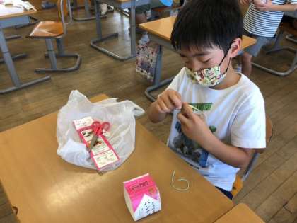 身近な材料を使って、動くおもちゃをつくっています。分からないところは友達と相談しながら、楽しく活動していました。