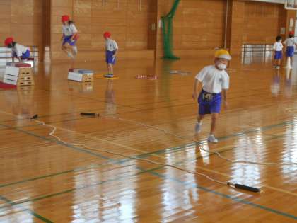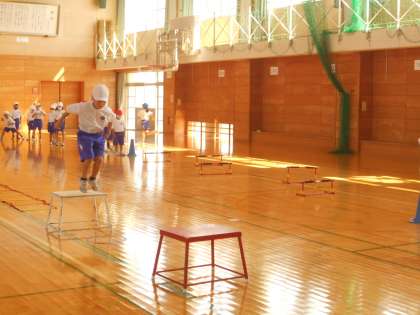 今回から、ミニハードルや跳び箱等を跳びこえる学習を始めました。いろんな物を片足や両足で跳びました。4コース用意してあったので、どのコースも楽しそうに取り組んでいました。