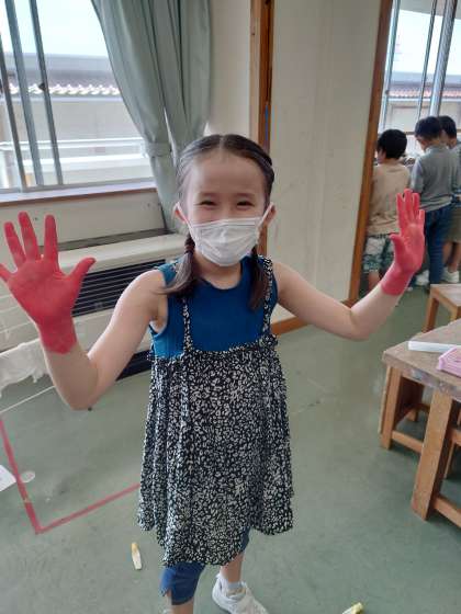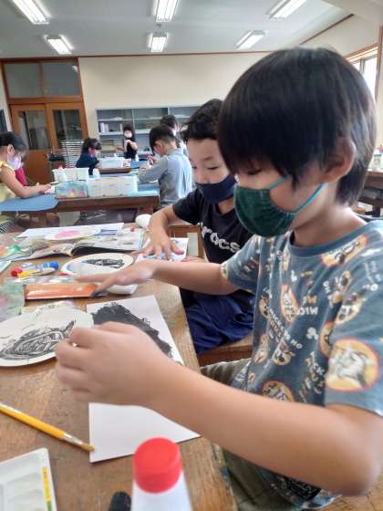 液体粘土に絵の具を混ぜて、絵をかきました。とろとろになった絵の具で楽しそうな子供たちです。