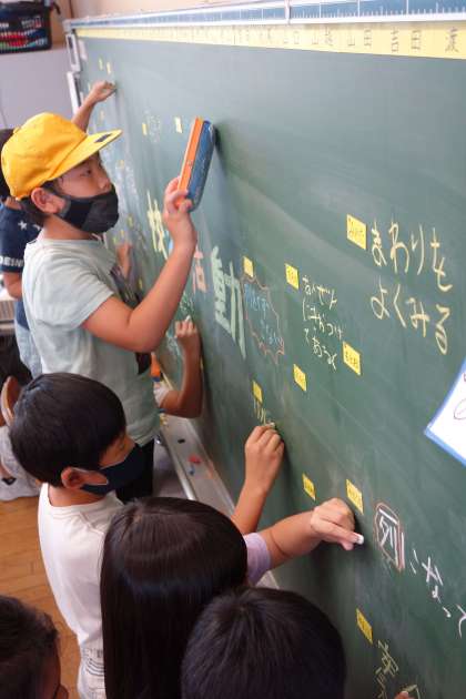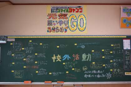 いよいよ明日が校外活動です。黒板に目当てを書き、明日への気持ちを高めました。