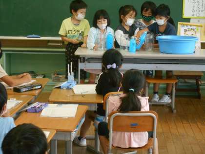 今回は、3種類のペットボトルの水の量を比べました。1つを空にして水を入れ替える方法や同じ入れ物を使って比べる方法等の考え方が子供たちから出てきました。