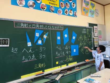 辺やちょう点の数をたしかめながら、三角形と四角形を見つけました。