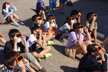 前回の学習で、かげの位置の変化と共に太陽の位置の変化に気付いた子供たち。今日は、遮光板を使って、太陽が動いていることを自分の目で確かめました。