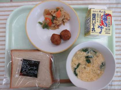 今日の献立は、食パン、ミートボールの照り焼き、れんこんソテー、卵コーンスープ、チョコレートクリーム、牛乳です。