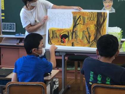 朝の読み聞かせの時間。絵本の中に隠れている動物を見つけたようです。絵本の素敵な世界に浸ることができました。