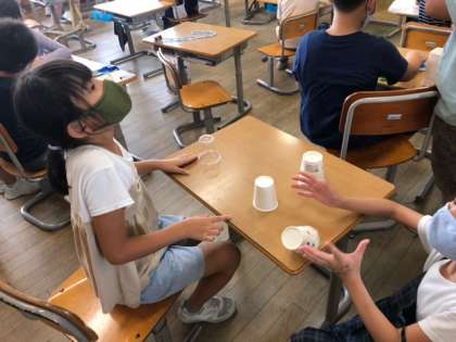 どうやったら高くとぶかを友達と相談しながらおもちゃ作りをしています。
