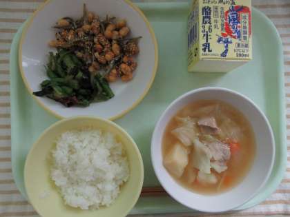 今日の献立は、ごはん、小魚入りフライビーンズ、海藻サラダ、ポトフ、牛乳です。