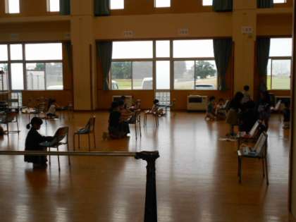 多目的教室で、互いにソーシャルディスタンスを保ちながら、鍵盤ハーモニカに挑戦しています。