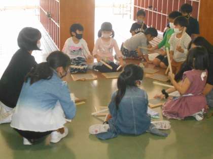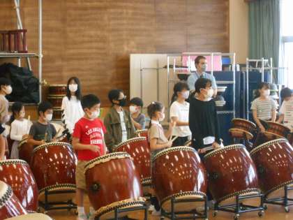 給食後、太鼓げんキッズ活動がありました。お兄さんお姉さんに教えてもらい、「まごころ」の曲を少しずつ覚えてきています。