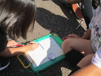 時間によって太陽の位置とかげの向きは変わるのか調べました。斜光プレートを使って太陽の位置を建物の場所とともに確認したり、ストローのかげを写し取り観察したりしました。