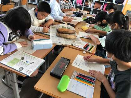 涼しくなりすっかり茶色くなった糸瓜の実の観察を行いました。色や重さの変化を実際に持ってみたりして感じ取っていました。