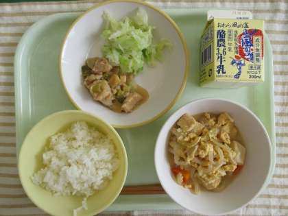 今日の献立は、ごはん、厚揚げの錦とじ、あっさりチキン、ゆでキャベツ、牛乳です。
