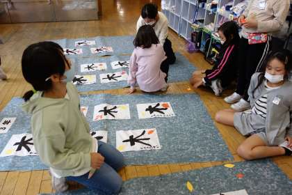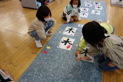 がんばって書いた「木」の書写作品の周りに、紅葉の飾り付けをしました。地域の方の書写の学習の成果を見ていただきましょう。
