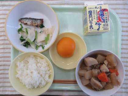 今日の献立は、ごはん、大根と鶏肉のうま煮、いわしの生姜味、かぶのいろどり、もも缶、、牛乳です。