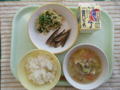 今日の献立は、ごはん、小あじの唐揚げ、ごまあえ、さつま汁、牛乳です。