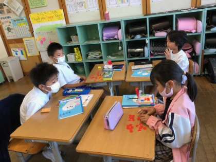 かけ算の式をおはじきで表しました。ペアになり、友達と問題を出し合って素早くおはじきを動かしていました。