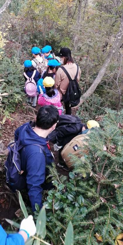 かなり急な下り坂があります。保護者ボランティアの方々が、温かい声をかけてくださったり、手をとってくださったりするおかげで、怖がる子供たちも助かっています。もうすぐ、林道に抜けます。
