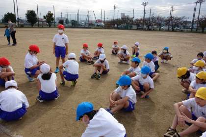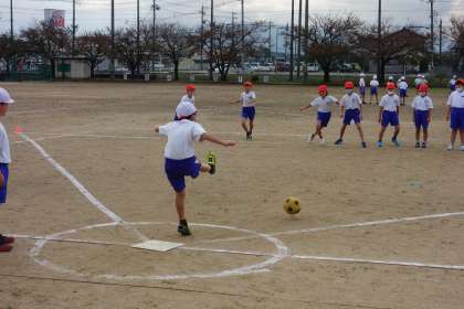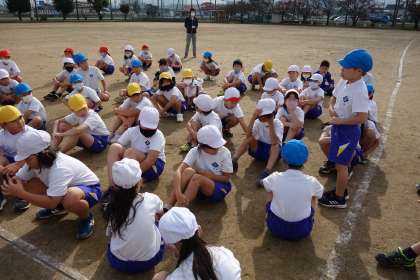 前の時間にベールボール型ゲームのルールを覚えた子供たち。今日は、チームごとに作戦を立てて、ゲームに臨みました。今日の振り返りを次の時間につなげましょう。