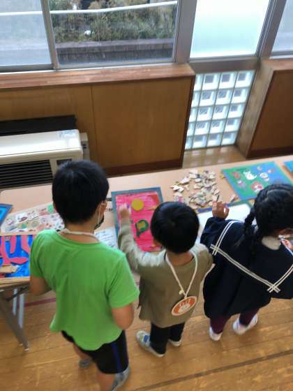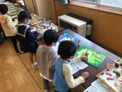 健診を終えた年長さんが楽しめるように図画工作科の学習で5年生が準備したゲームは大好評でしたよ。