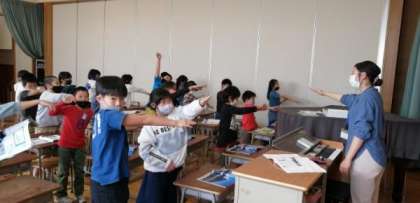 日本一の山「ふじ山」の歌を歌いました。歌詞や曲の感じから、どこを盛り上げて歌えばよいか考えました。半分に分かれて練習し、聴き合いました。