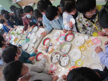 図工では、紙粘土で作ったごちそうを、パーティーのように並べました。お皿の並べ方にもこだわる子供たちでした。美味しそうなごちそうを見て「お腹すいた!」と話す子供もいました。
