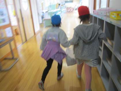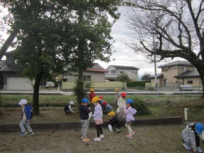 久しぶりにグラウンドへ秋見つけに行きました。前回よりも落ち葉やどんぐりがたくさん落ちていたり、木の葉が色づいていたりすることに気付きながら、楽しそうに秋を見つけていました。袋いっぱいの落ち葉やどんぐりを、友達と嬉しそうに持ち帰っていました。