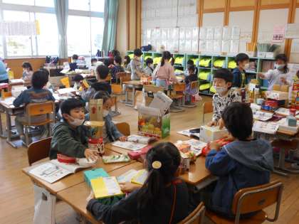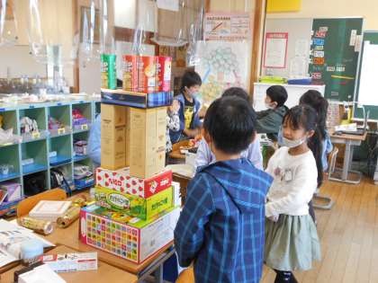 班になって、みんなが持ってきた箱の大きさや形を考えながら作りました。高いタワーを作るためには、箱を立てて使うと高くなることや下に大きい箱を置き、上に小さい箱を置くと安定することに気付いていました。