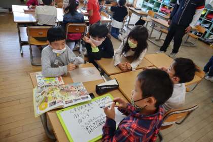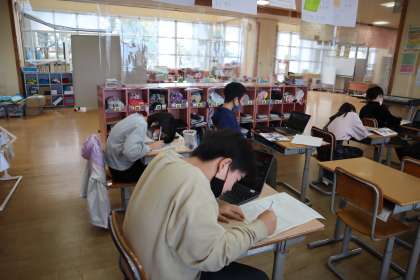 1枚目は、2年生が町探検でどこに行けばよいか話し合っています。2枚目は、6年生が未来の自分の様子を思い浮かべて作品づくりをしています。