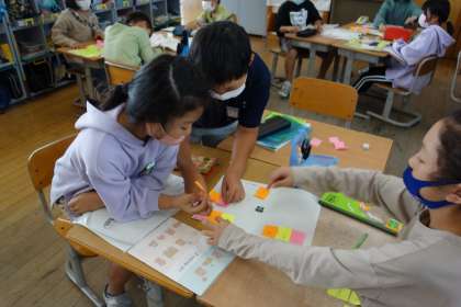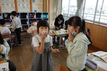 手作り楽器を作って音を出してみました。音が出ているときは「震えている」ことに気が付いた子供たち。次の時間は、音楽室の様々な楽器の様子を確かめることになりました。