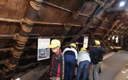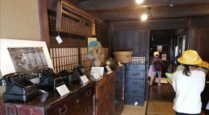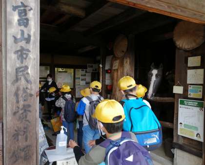 民俗資料館では、富山市の歴史について話を聞いたり、稲作に使われた道具を見たりしました。合掌造りの2階は、茅葺きの屋根裏で、子供たちは、初めての経験に大喜びでした。