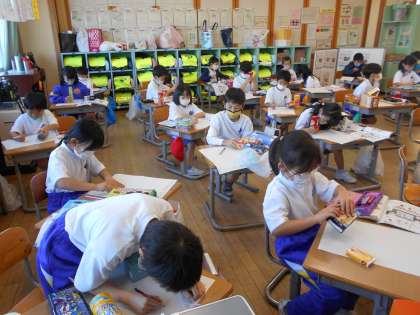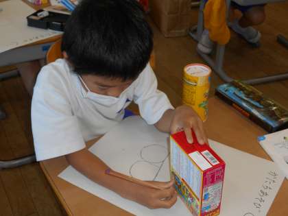今回は箱の形を写して、花や車等の絵を描きました。箱のいろんな面を使って工夫していました。