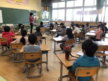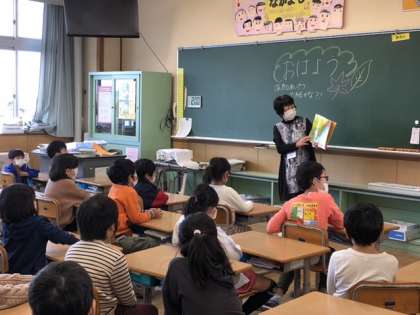 お楽しみの読み聞かせです。背すじピンのよい姿勢で聴いています。
