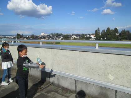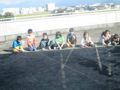 鏡ではね返した光はどのように進んでいくのか調べました。光はまっすぐ進むことや、はね返った光が日陰に当たると明るくなることなど、実験する中でたくさんの発見があったようです。