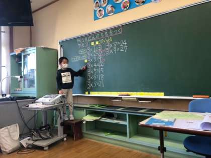 九九の学習を進めています。今日は、3のだんです。気付いたことを友達に伝え合いました。