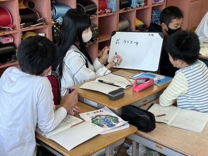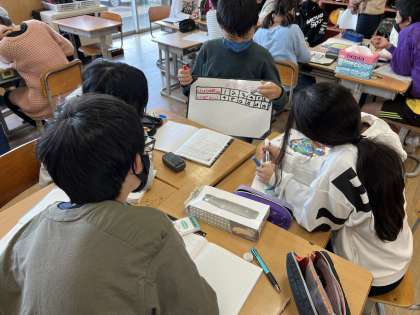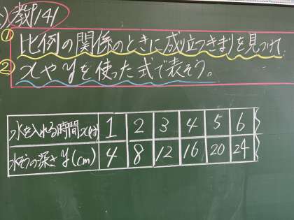 算数科では、表をもとに、比例の関係のときに成り立つ決まりを見つけ、Xやyを用いた式で表しました。自分の考えをもった後、グループで聴き合いました。