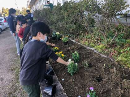 2年生で、花壇に花を植えました。色とりどりの花に癒やされていた子供たちでした。