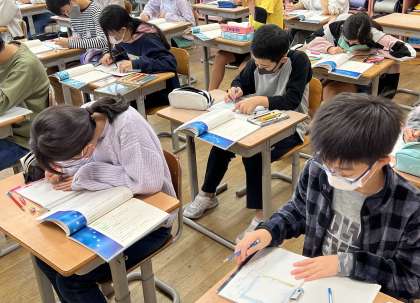 国語科「やまなし」の学習では「五月」と「十二月」の2つの場面の違いを比較するために、叙述をもとに想像図(絵)を描きました。これをもとに、次の時間に話し合います。